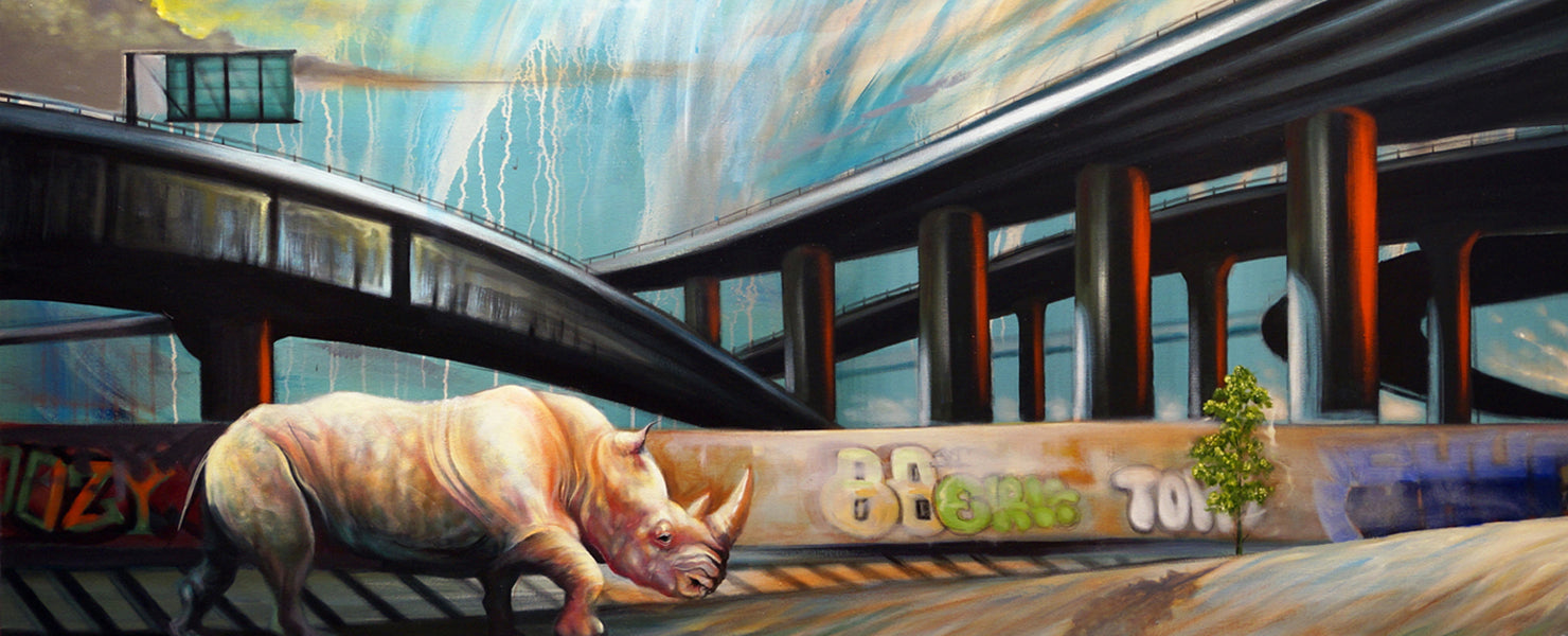 These paintings celebrate the pure love and admiration I have for all animals. Painted into bold urban and abstract color fields, their grace and intentions often mirror situations relatable to the human experience.